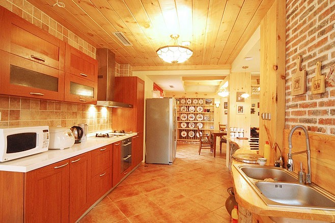 廚房的吊頂使用藍色就會顯得純潔可愛、惹人遐思。其次,在藍色的掩映下,廚房就顯得更加清新淡雅,富于裝飾味道。對于工作緊張的白領來說,藍色的廚房吊頂可以讓喧囂的心靈靠岸寧靜的港灣。