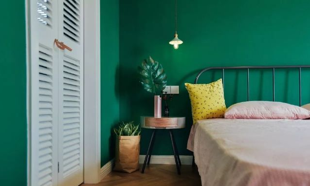 · 墨綠墻壁與綠色配飾搭配使用,如墨綠墻壁搭配薄荷綠的吊燈,同時床頭柜上的龜背竹是第三重「綠」。