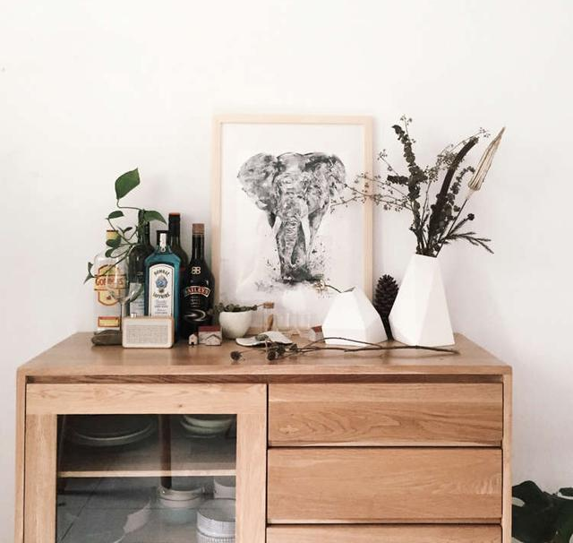 用裝飾畫、小盆栽來裝飾餐邊柜的臺面。
