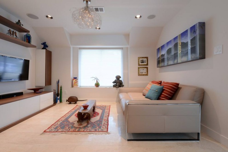 先對墻面進行面層處理,解決掉裂縫、起皮、發霉等墻面問題后,用膩子找平、打磨平整之后刷上乳膠漆。墻面上下部與頂面、地面相接的地方分別用石膏線、踢腳線的等收口裝飾。這種方法簡單快捷,還能配合畫框、相片框、燈光等多種點綴方式,使墻面效果更加多樣化。
