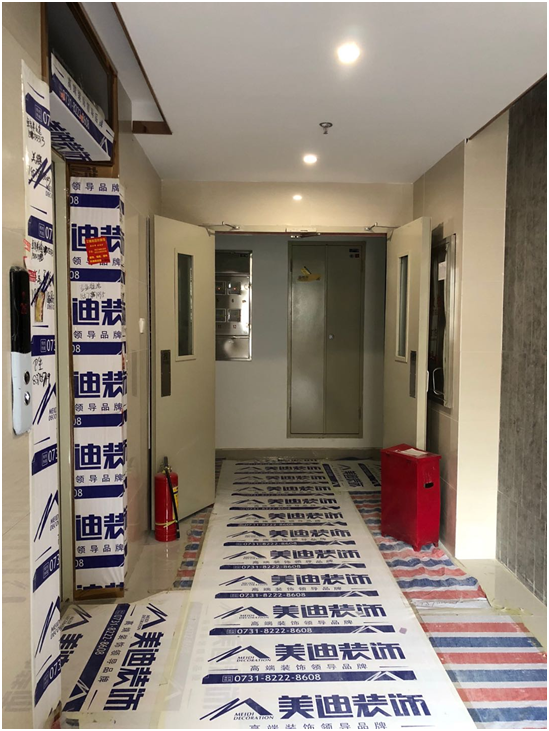 第一站,北辰三角洲E4區,這是一套面積為120余平米的房子,目前正處于水電驗收階段。一進門,便能看到貼有美迪裝飾專用的保護膜,這屬成品保護。它是保證裝修品質的第一步,能對成品進行嚴格保護,預防二次破壞。
