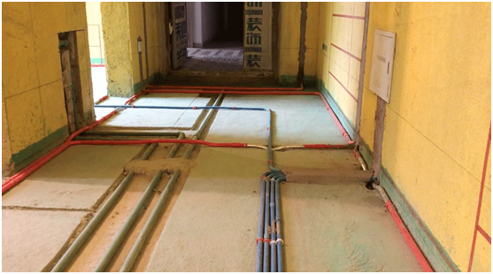 進入室內,因是水電工程階段,最顯眼的就是各種橫平豎直的管道了。根據管道紅、藍