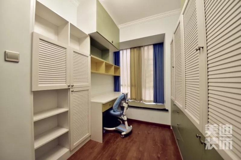這是專門為豆豆設(shè)計的書房,色系也是選擇讓人舒服的暖色調(diào)。米色書柜與淡藍色窗簾結(jié)合,動靜結(jié)合,不失靈動。