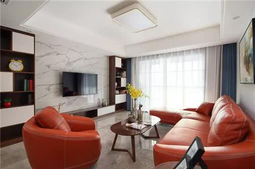 ▲非常時尚的客廳,橘色的皮質沙發和休閑座椅,可謂是賺足了眼球。電視背景墻由大理石打造而成,蠻現代化的,很顯大氣。兩邊還設計了實用的收納柜,放收藏品放書特別好。