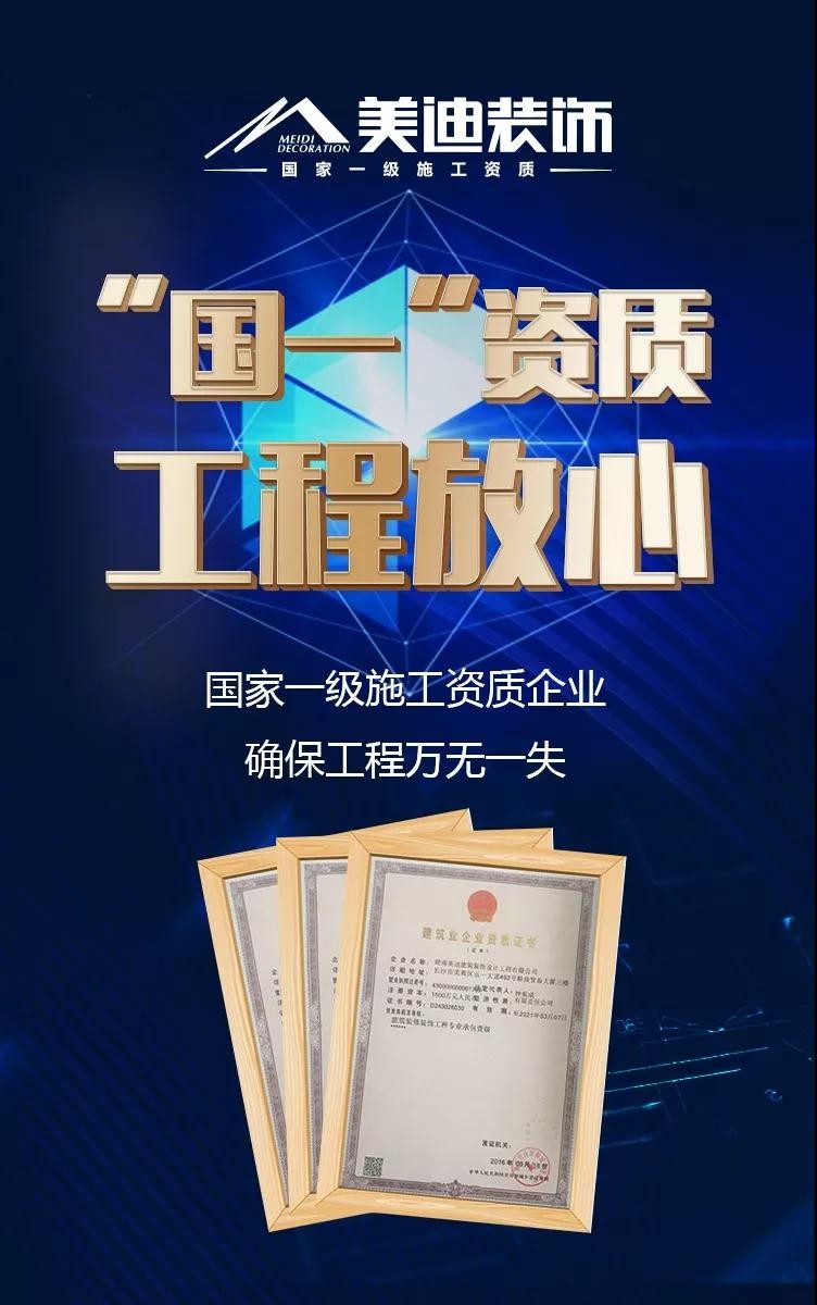 美迪裝飾工程品質得到了國家住建部的認可,2016年被授予國家一級施工資質,它是家裝工程的最高榮譽,擁有該資質的家裝企業僅為千分之一。