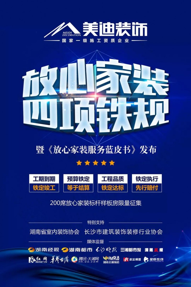 5月25日,由美迪裝飾編制,湖南省消費者委員會、湖南省室內裝飾協會、長沙市裝飾裝修行業協會審核通過的《放心家裝服務藍皮書》發布。31日,美迪裝飾“放心家裝”全省工藝擂臺賽啟動,500支金牌施工隊參與比拼,十余家權威媒體全程監督。
