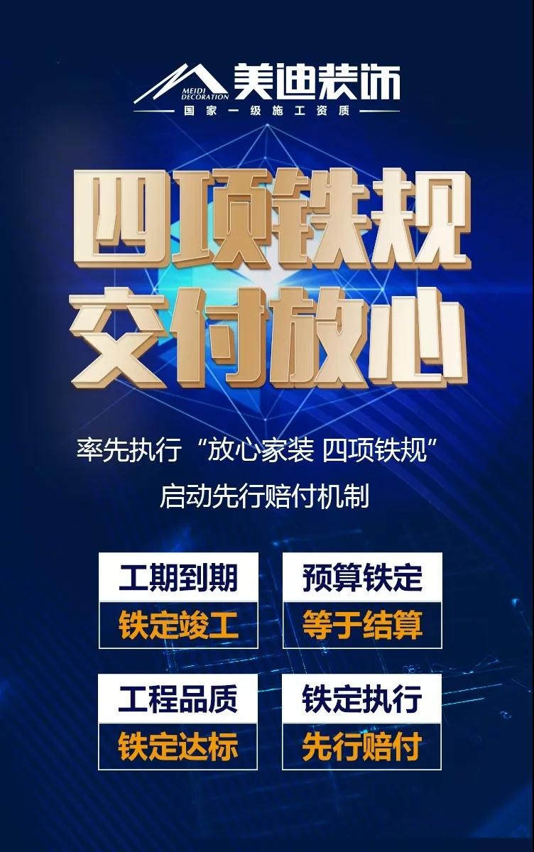 美迪裝飾作為誠信家裝企業,向廣大消費者鄭重承諾,鐵定執行“放心家裝”四項鐵軌:工程到期鐵定竣工、預算鐵定等于結算、工程品質鐵定達標、鐵定執行先行賠付,為消費者打造高品質放心家裝。