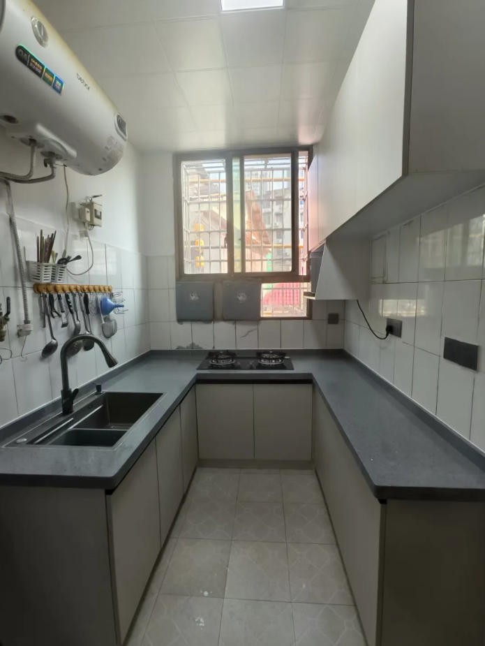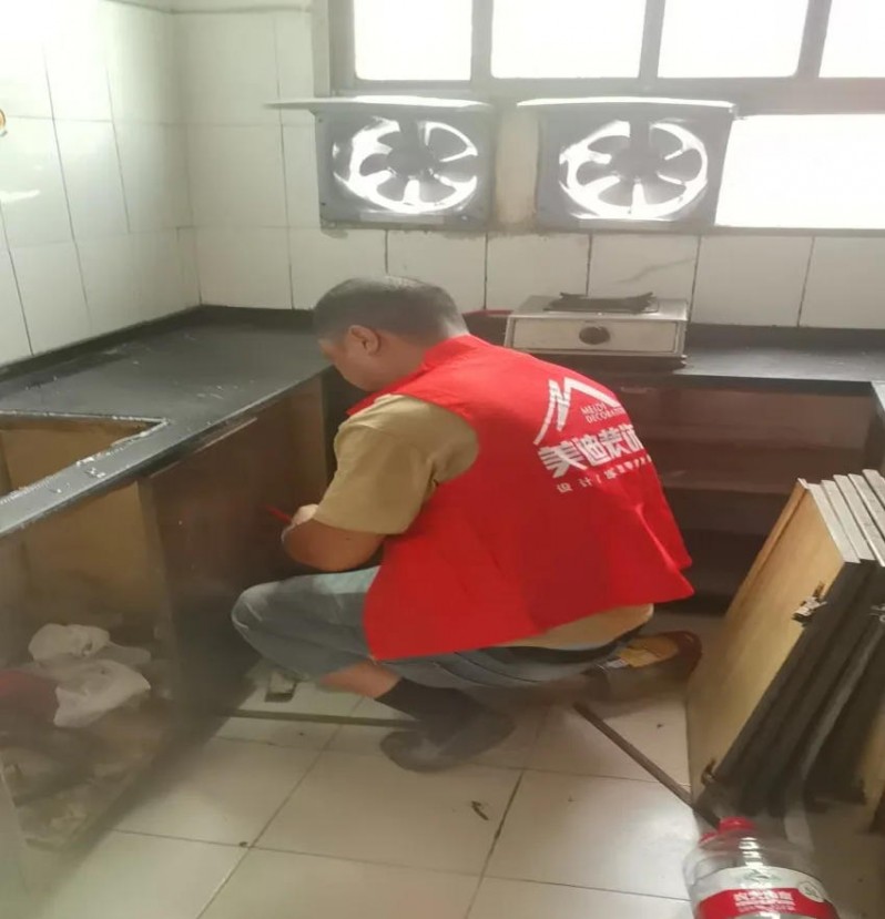 美迪裝飾改造團隊將墻頂開裂的客廳粉刷一新,還對廚房進行了“煥然一新”的徹底改造,拆除了老舊廚柜、吊頂;重新進行水路、電路改造;新鋪的防滑地磚平整紋路清晰、顏色亮麗,量身定制的適老化廚柜高度適中,人性化的收納空間,極大方便了老人操作。全新的吊頂和吸頂燈,讓整個空間充滿了明亮生機。