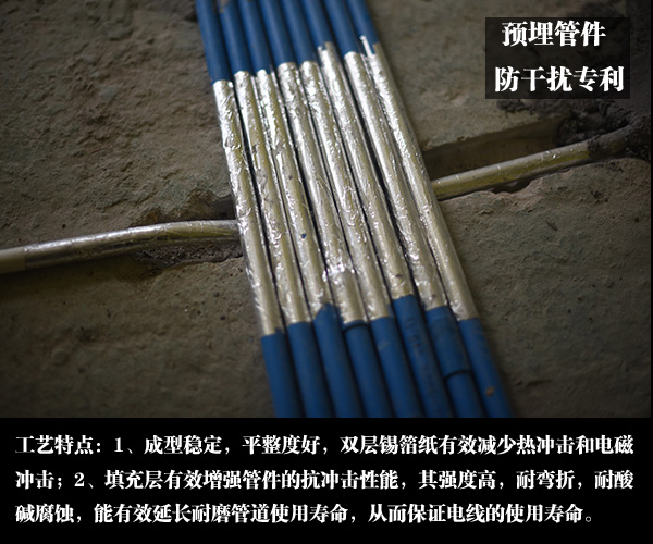 預埋管件防干擾專利實用新型成型穩定,平整度好、利用雙層錫箔紙光潔度和熱反射性有效減少外界環境以及交叉管線對管道的熱沖擊和電磁沖擊,同時,其內填充的石英砂和CPVC支撐管能有效增強管件的抗沖擊性能,其強度高,耐彎折、耐酸堿腐蝕性能優越,能有效延長耐磨管道的使用壽命,進而保證其管道內纜線的使用壽命。