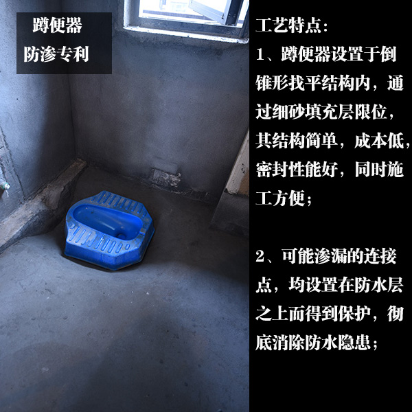 衛生間蹲便處預留凹坑,污水可直接通過凹坑排入下水道,防止積水受潮。地面防水工程處理完后,必須現場注水進行耐水、隔水測試。衛生間下水道經特殊處理防止水管老化開裂。