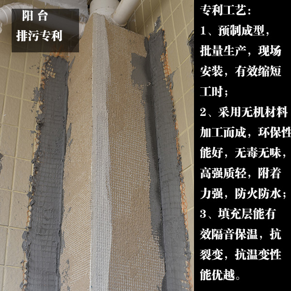 實用新型的預成型排污管外管為預制結構,可進行批量化預制以方便在裝修現場成批安裝,有效縮短了裝修工時。同時,由于采用無機材料板作為基板進行加工制作而成,其環保性能好、無毒無味、高強質輕、膠面附著力強且防火防水,配合玻璃纖維填充層能有效隔音保溫,同時抗裂變、抗溫變性能優越,可廣泛應用于廚房煙道、衛生間、陽臺排污管道,消防管道包裝。