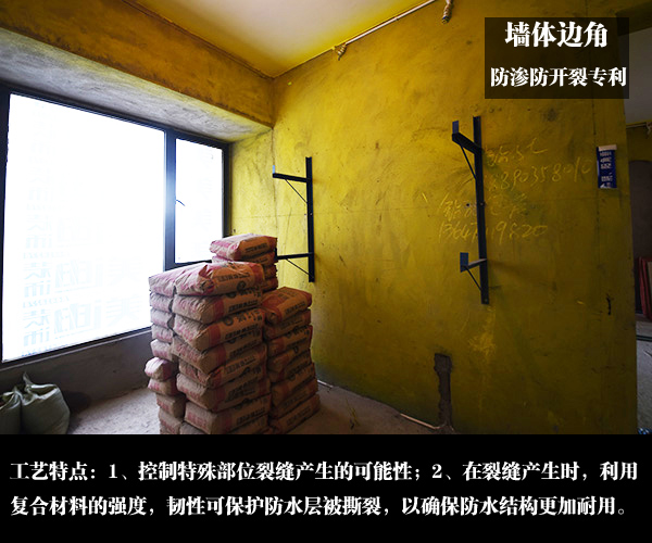 實用新型的防滲防開裂墻體邊角結構施工方便,周期較短,可在施工完成后對墻體邊角位置進行包裹保護,控制墻體邊角位置的裂縫產生的可能性,同時在裂縫產生時利用復合材料層進行連帶加固保護,復合材料層的韌性可保護防水層在較大強度下不被墻體裂縫撕裂,以確保防水結構更加耐用。