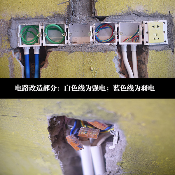 電路布線時,強電、弱電分開,強電部分為白色電線、弱電為藍色電線,同時在每個電線接口處都包裹有一層錫箔紙防止電流干擾。